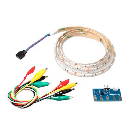 キットに入っているもの。右上のLEDテープのコントローラを使えば、micro:bitなしでLEDテープを利用する事ができます。今回は使いません
