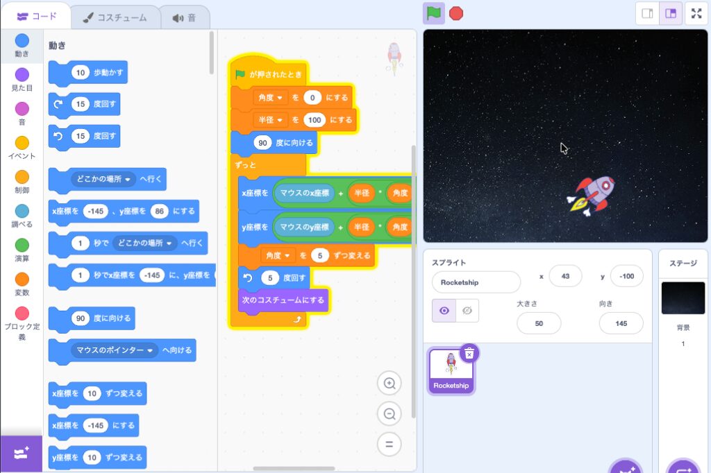 【Scratch】マウスの周りをまわる Scratch作例 X Facebook はてブ LINE コピー 2025.11.28 ロケットがマウスカーソルの周りを回るプログラムです Scratch 3.0に対応した書籍です[PR] リンク リンク リンク