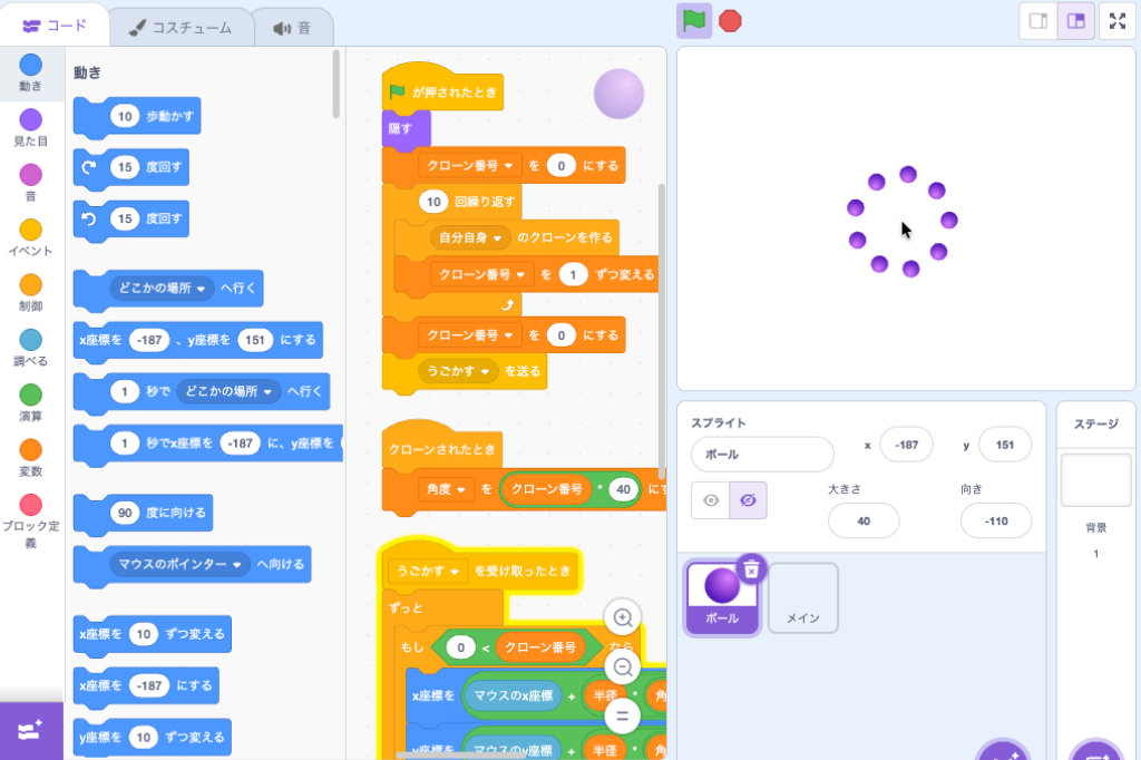 【Scratch】マウスの周りをまわる2 Scratch作例 X Facebook はてブ LINE コピー 2025.12.01 マウスカーソルの周りをボールがまわるプログラム。マウスダウンで、ボールがカーソルにギュッと近づきますスプライトを画面外に配置することができないので、カーソルが画面の端に移動したとき、ボールを非表示にしています Scratch 3.0に対応した書籍です[PR] リンク リンク リンク