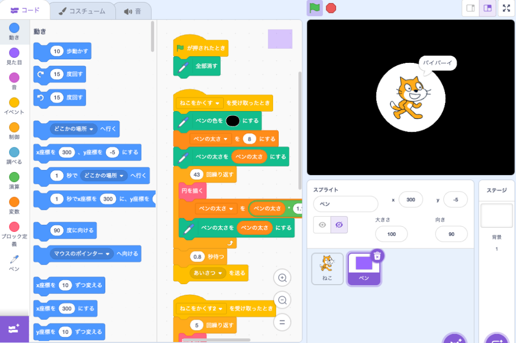 【Scratch】アイリスアウト(映像表現) Scratch作例 X Facebook はてブ LINE コピー 2025.11.25 アイリスアウト(円形の範囲がだんだん小さくなっていき、最後に真っ暗になる演出)のプログラム大きな円のペンサイズをどんどんと太くすることで、表示エリアを小さくしています Scratch 3.0に対応した書籍です[PR] リンク リンク リンク
