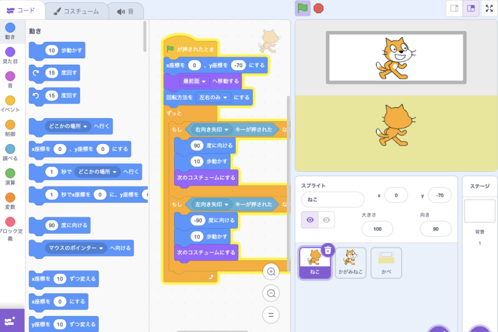 【Scratch】かがみに映るねこ Scratch作例 X Facebook はてブ LINE コピー 2025.11.18 かがみに映るねこです。左右キーでねこをうごかしてください Scratch 3.0に対応した書籍です[PR] リンク リンク リンク
