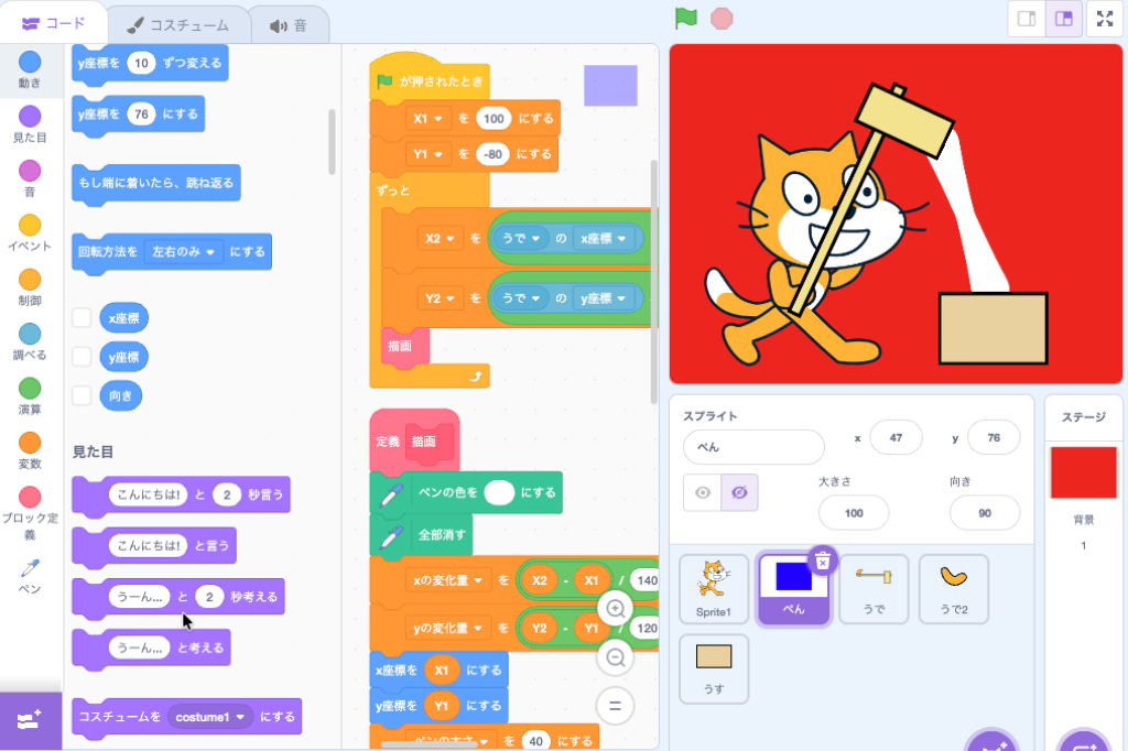 【Scratch】おもちつき Scratch作例 X Facebook はてブ LINE コピー 2026.01.03 ネコがおもちをつきます。おもちはペンで描画しています。 Scratch 3.0に対応した書籍です[PR] リンク リンク リンク
