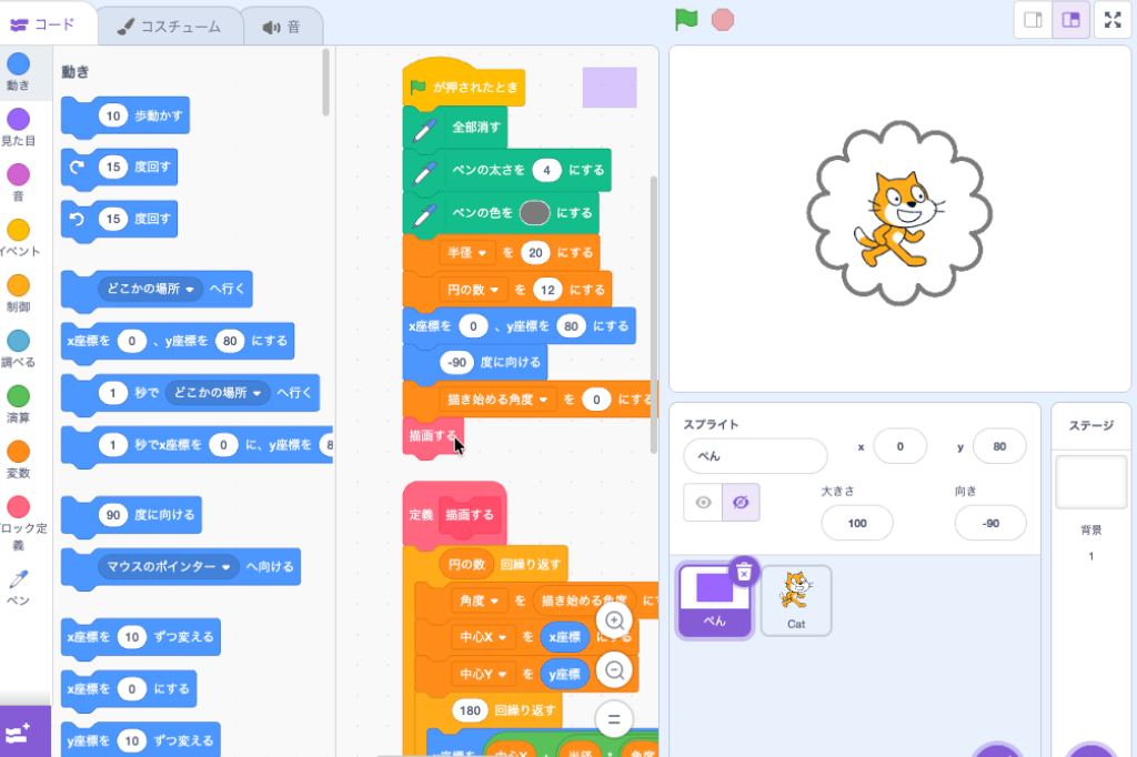【Scratch】もこもこした円を描く Scratch作例 X Facebook はてブ LINE コピー 2025.12.03 もこもこした円をペンで描くプログラムです Scratch 3.0に対応した書籍です[PR] リンク リンク リンク