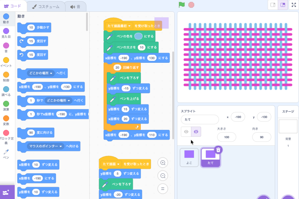 【Scratch】たての糸・よこの糸 Scratch作例 X Facebook はてブ LINE コピー 2025.12.19 交差したたての糸とよこの糸を描画するプログラムです Scratch 3.0に対応した書籍です[PR] リンク リンク リンク