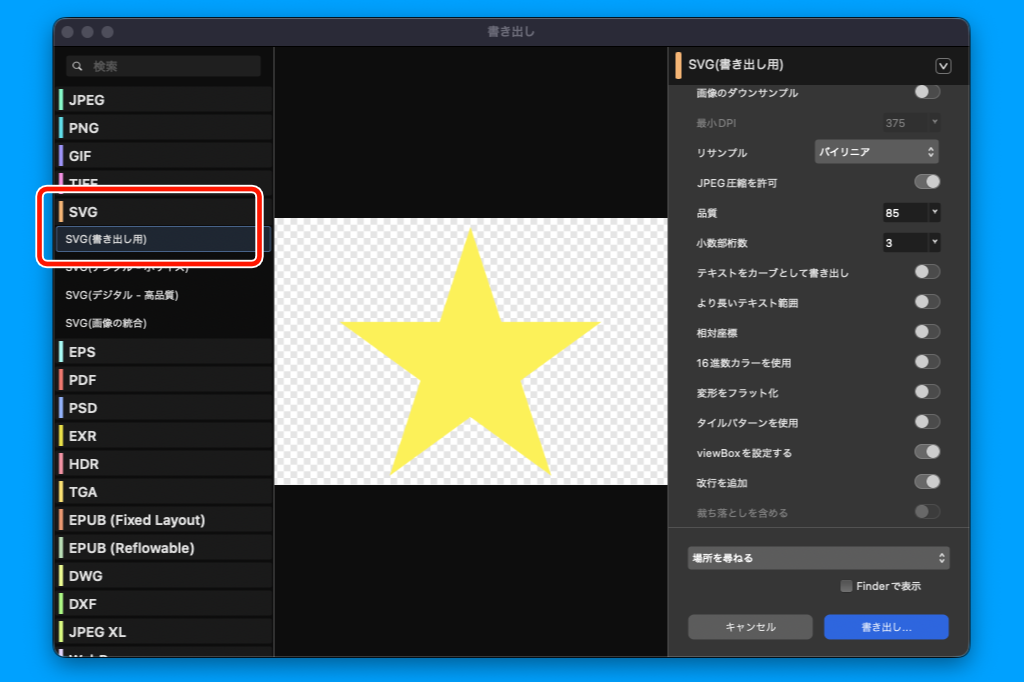 ただ、Affinityで出力したSVGをそのまま読み込むと、エディタに画像が表示されません。たぶん、スプライトとしては普通に使えると思うのですが、ちょっと気持ちが悪いです