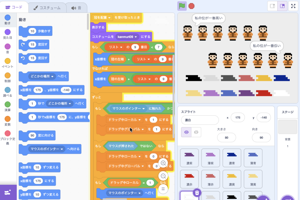 【Scratch】冠位十二階 社会 X Facebook はてブ LINE コピー 2025.09.29 正しい色の冠をドラッグして役人にかぶせるプログラムです Scratch 3.0に対応した書籍です[PR] リンク リンク リンク